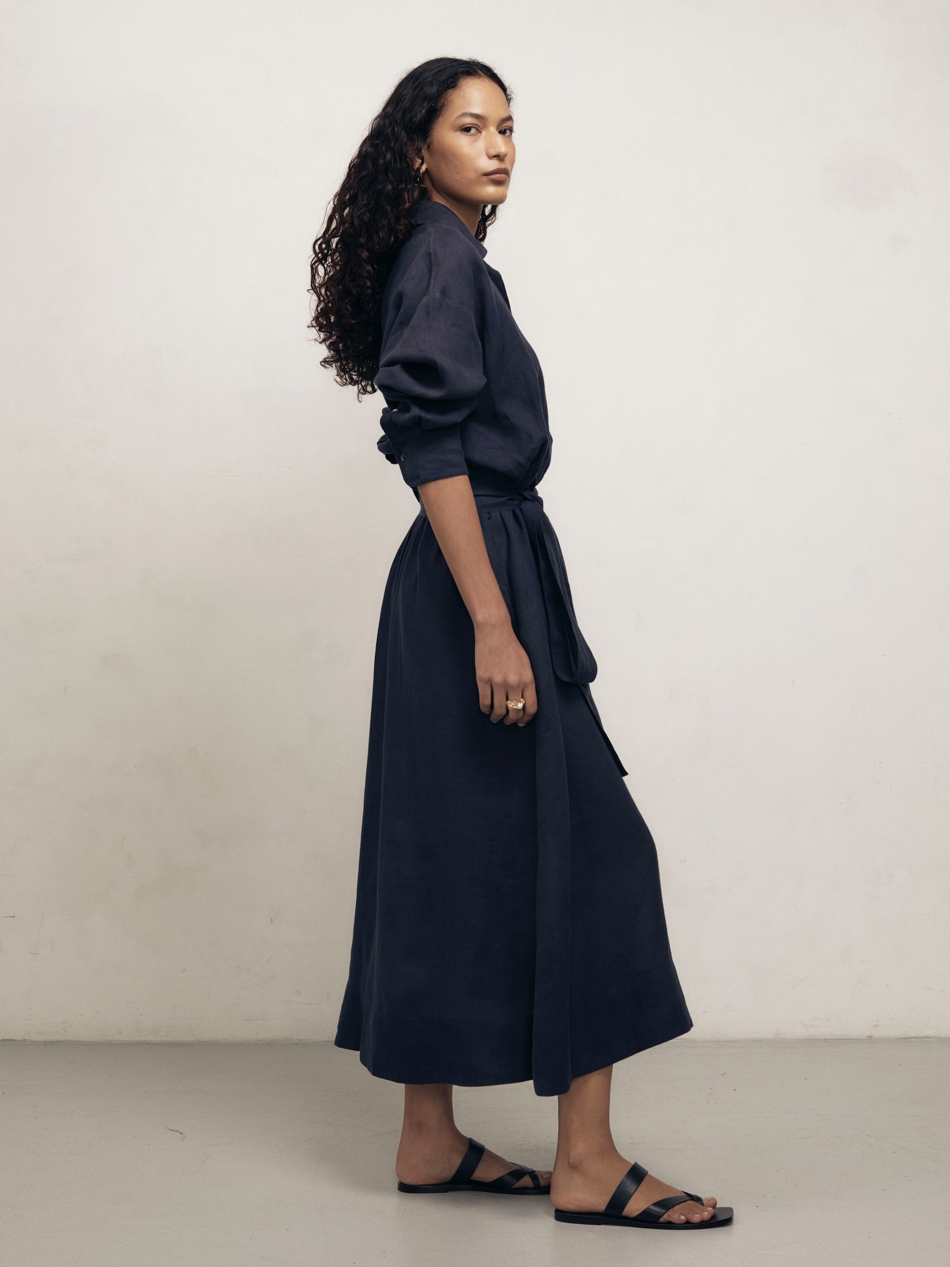The IRA dress is one of our favourite styles. It has an easy-breezy feel, not least because it is finely crafted from pure linen (in the loveliest dusty navy shade), and cut for a relaxed fit. It is replete with considered detailing that includes a concealed placket, chest pocket and gently dropped shoulders. Make use of the detachable belt to define your waist, finishing with simple sandals and a woven tote.
