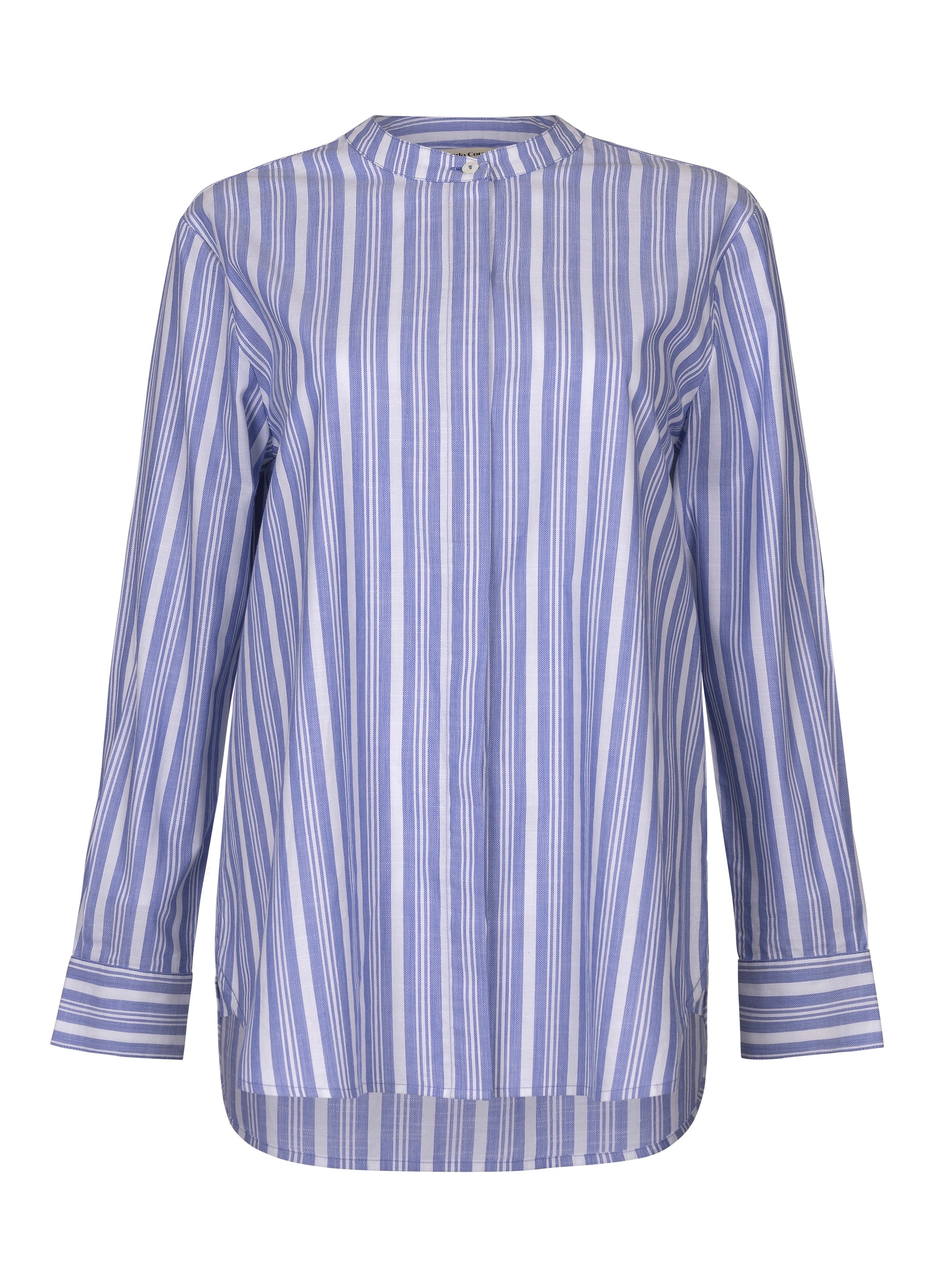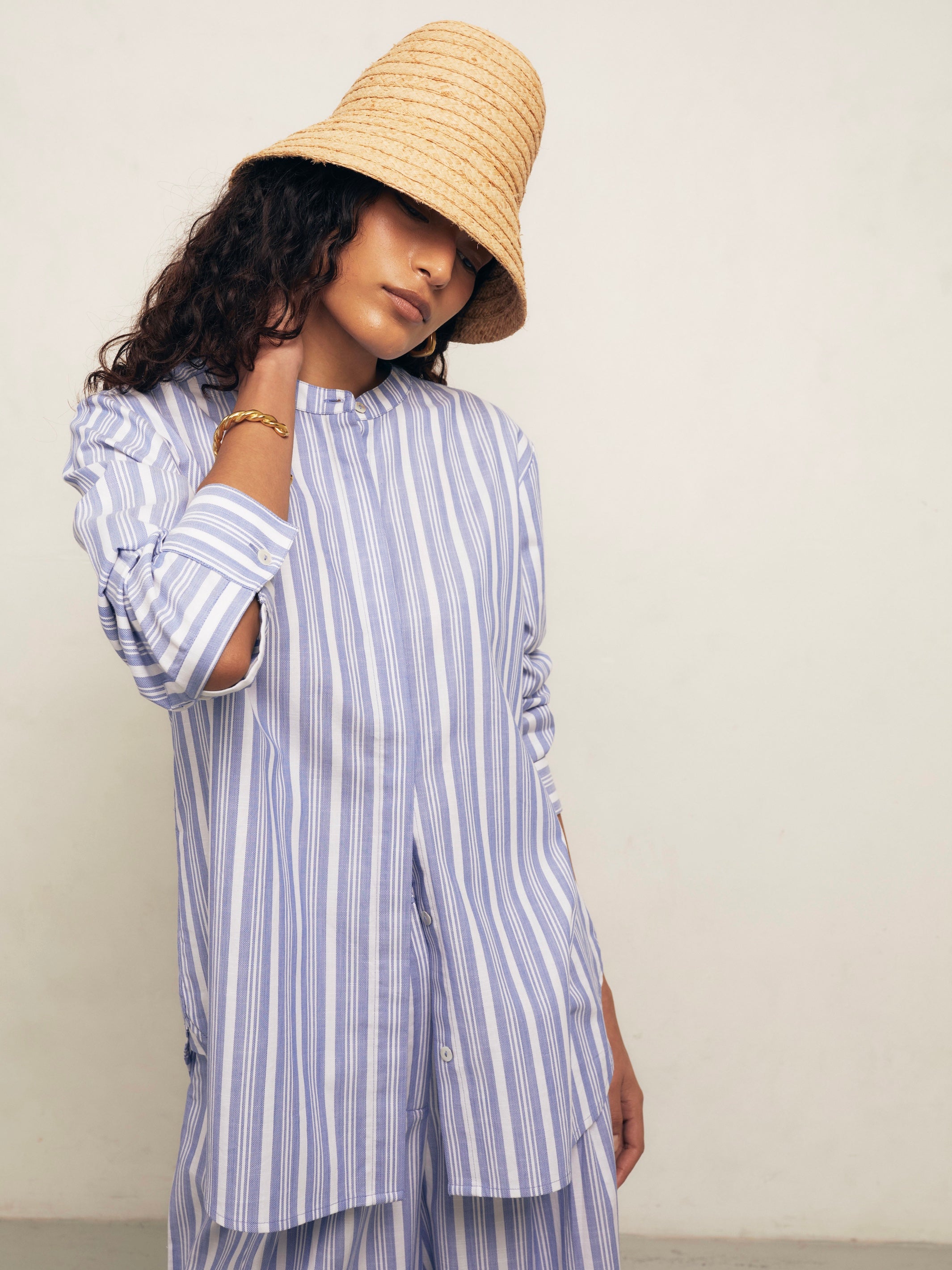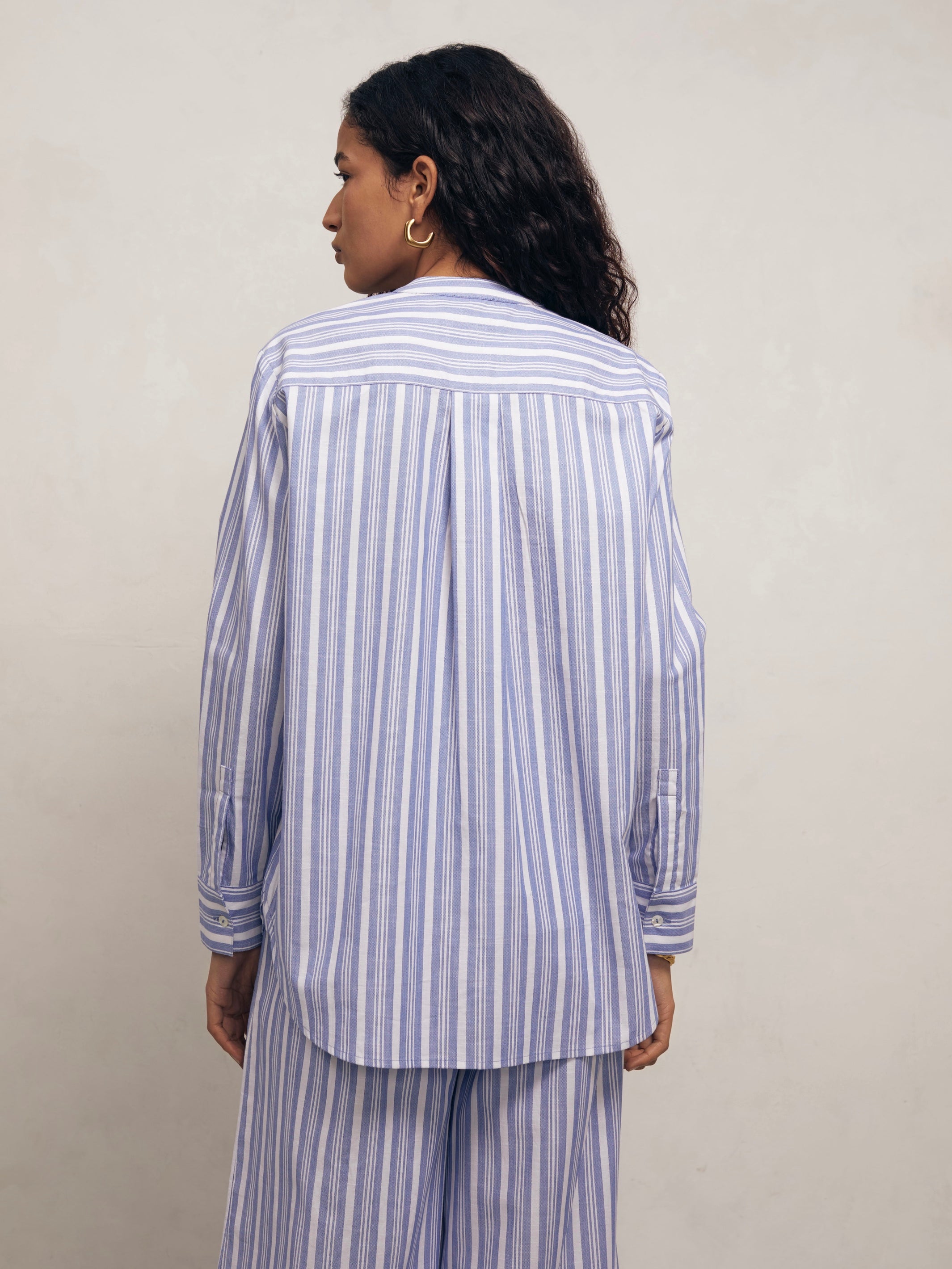 A striped shirt is timeless, and we're particularly fond of Pierre – new, for Spring/Summer '25. This collarless shirt is rendered in a woven, linen-cotton weave. It has a concealed placket, buttoned cuffs, and a box pleat at the back. The relaxed silhouette makes it perfect for holidays and weekends alike; style it with the coordinating Lulu skirt, ballet flats, and a woven tote.
