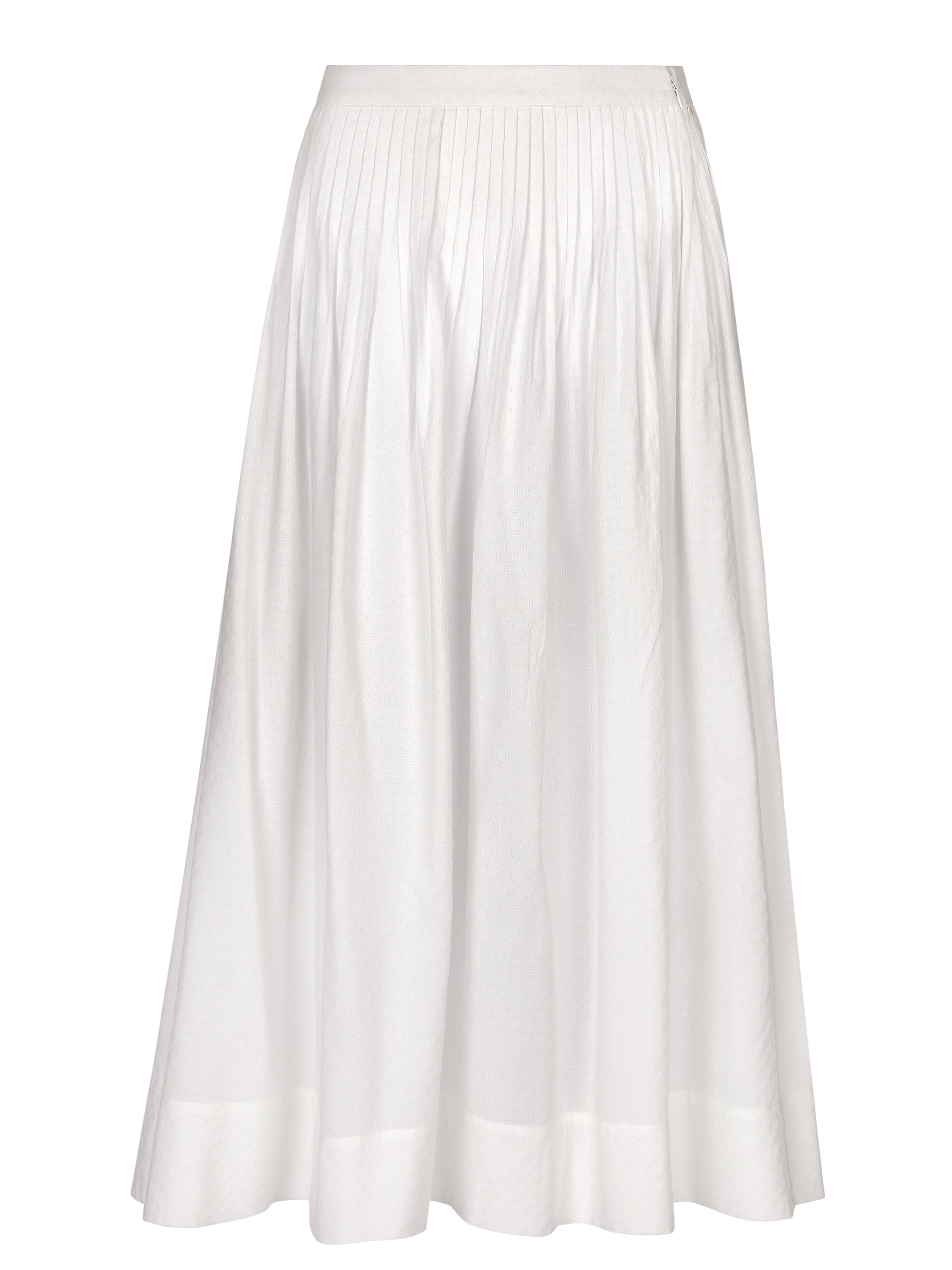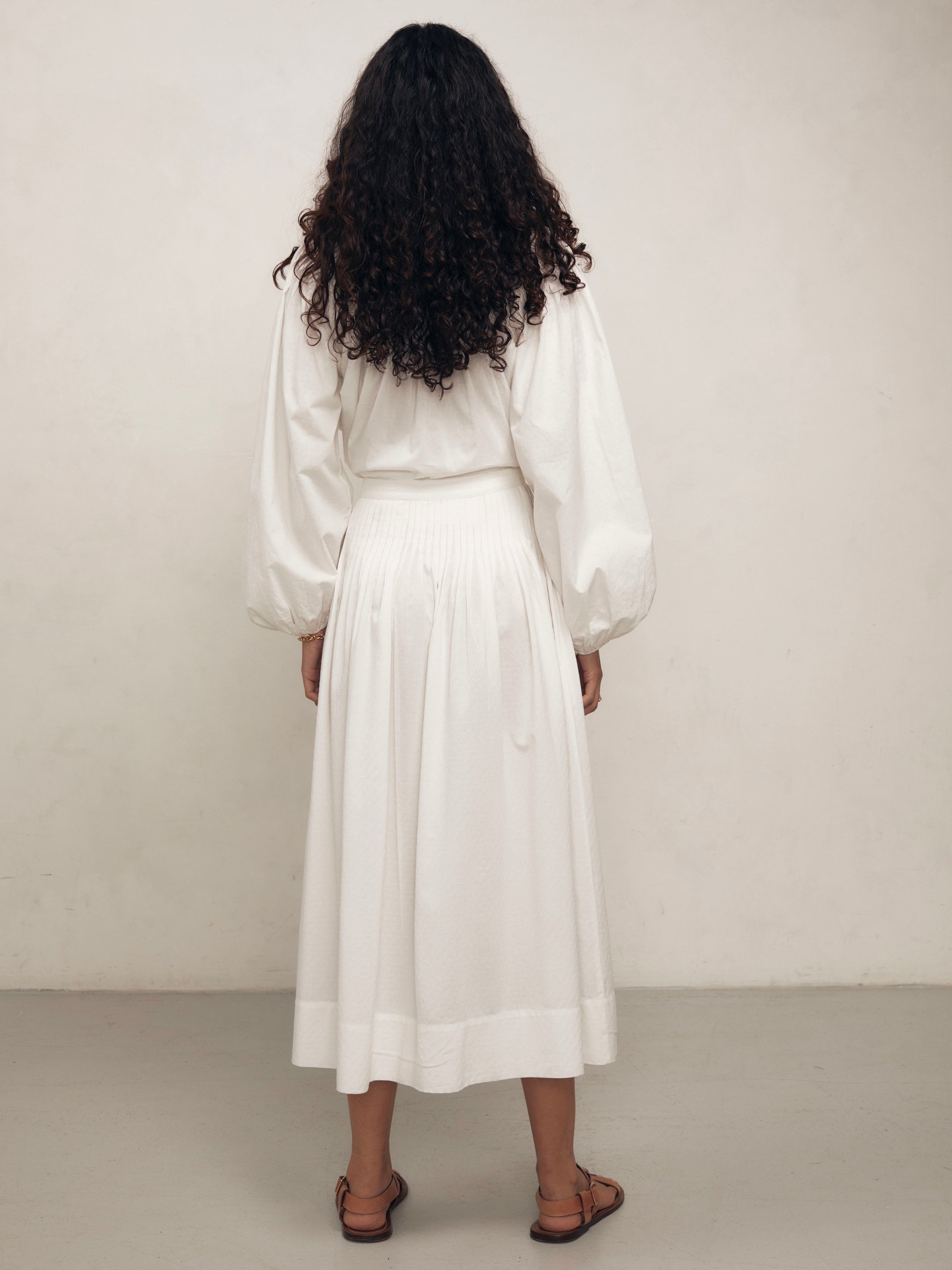 Suki is a summer staple. This effortlessly romantic midi skirt is made from breezy white cotton-dobbie, which is distinguished by a finely textured appearance, and detailed with ultra-fine pleats that create beautiful movement as you walk. Styling-wise, tuck in the coordinating Elizabeth blouse and finish with leather sandals and a basket bag.