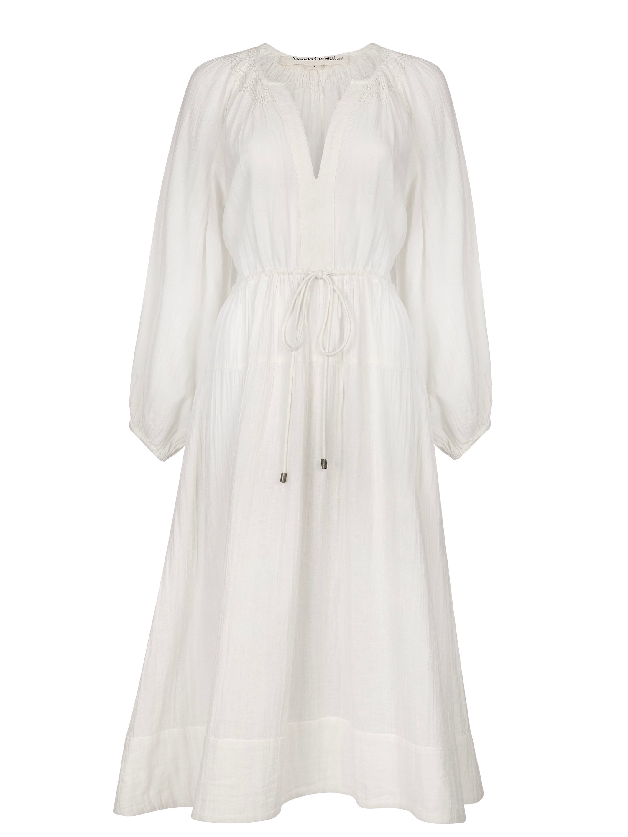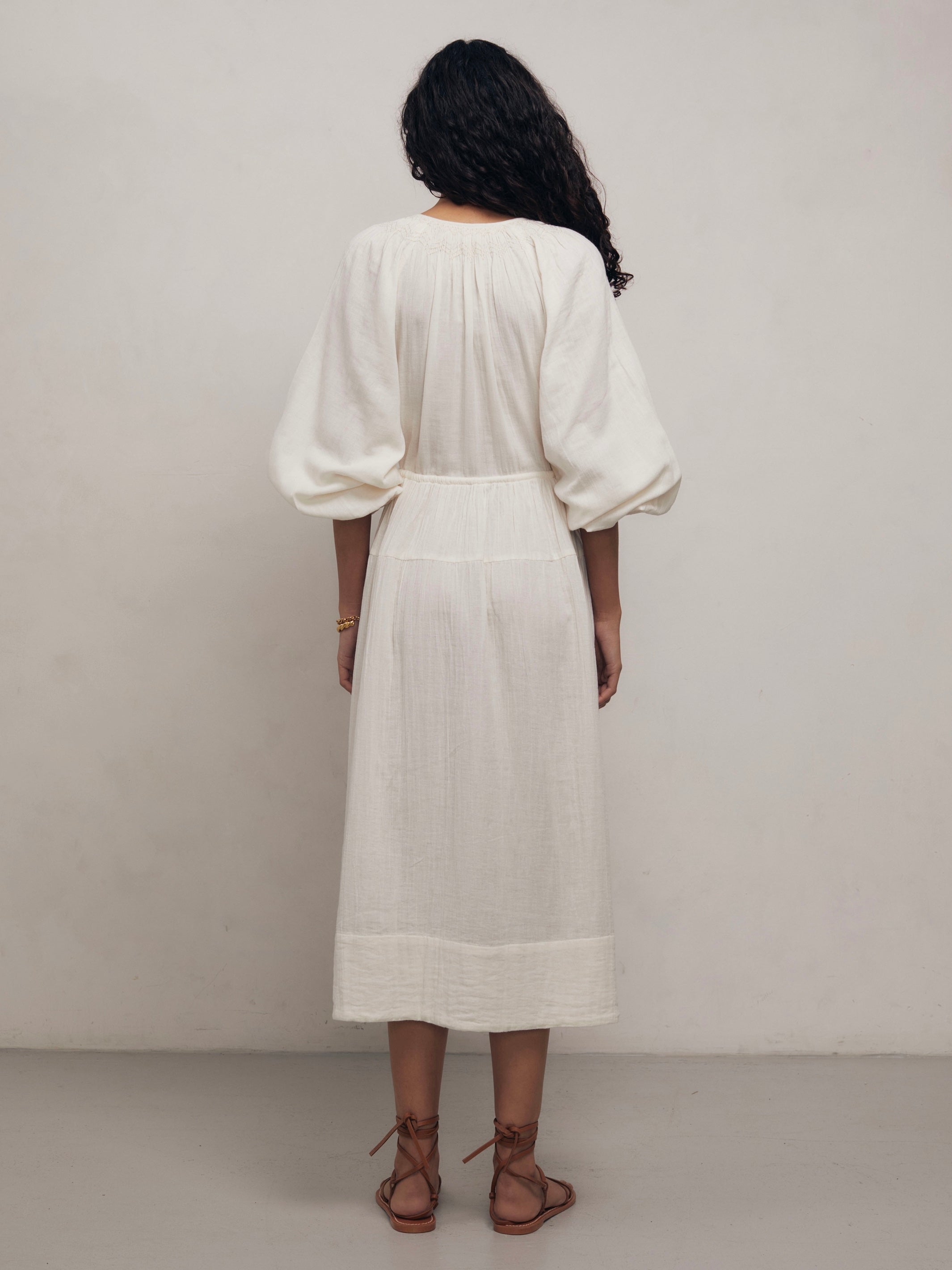 Defined by billowing sleeves and a full, gathered skirt, the Victorine dress makes a lasting impression. Its dramatic proportions were inspired by the dresses worn by Victorine Meurent, a 19th century French painter celebrated for her daring compositions. It is made from pure cotton gauze, and features smock detailing at the neck as well as gathered cuffs (for the perfect sleeve length) and capacious pockets. Adjust the drawstring waist to achieve your desired silhouette and finish with oversized earrings, pointed flats and a structured tote.